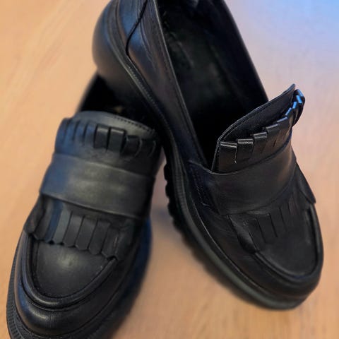 Nye sko ikke brukt Roots mokkasiner sko i størrelse 40 i svart skinn. Skoene har kraftig, mønstret yttersåle og overdel med dekorative frynser og bred rem over vristen. Innvendig såle er i skinn med Roots-logo. Passer som hverdagssko eller til mer pene antrekk i sesonger der man bruker lukkede sko. Nye Loafers Roots skinnsko ikke brukt. Noe romslig i størrelsen så tilsvarer 40 1/3 (41) Førpris 1700 kr.