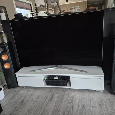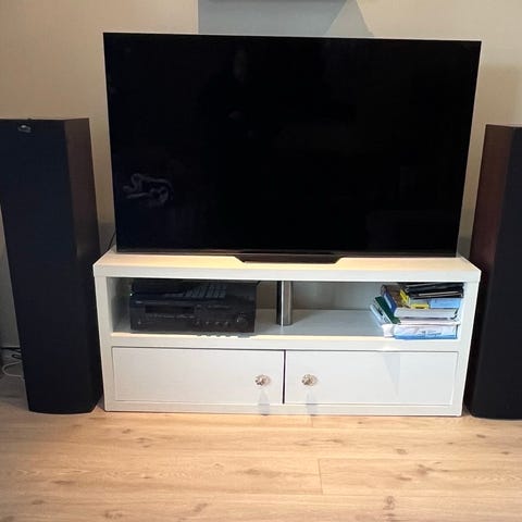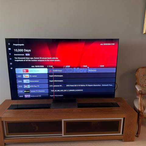 Selger alt på bildet utenom Sonos-anlegget. TV'n er en Samsung 82' smart-tv. Litt usikker på spesifikt årsmodell. Men den har innebygd smartfunksjon og god bildekvalitet.