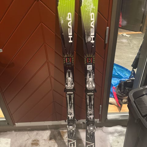 Skiene har svart overflate med grønne detaljer og leveres med integrerte bindinger, som vist på bildene.