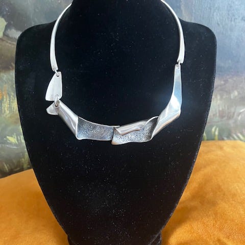 Collier/chocker av Albert Scharning i 925S. Smykket er i forgylt sølv med hvit speilemalje over mønstret bunn. Smykket er velholdt og emaljen er pen.