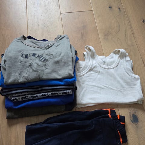 Ull fra Vilje & Ve. Str 122 - 128. To gensere og en bukse. Buksa har en liten rift i ytterste stoffet bak på rumpa, ellers helt og pent. Noen nupper.