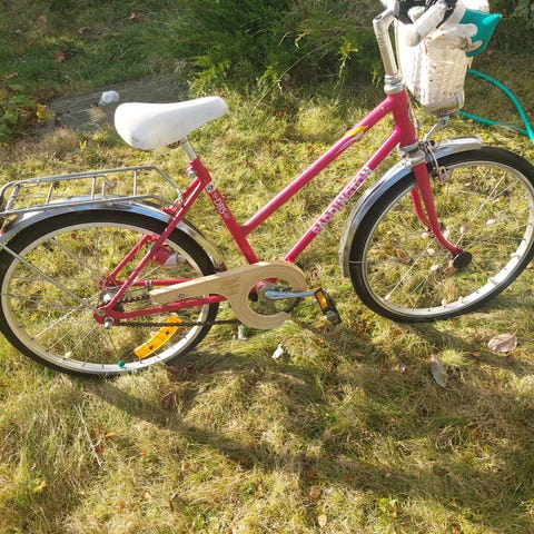 DBS barnesykkel med 24" hjul i lilla og hvit farge. Sykkelen har dempegaffel foran, girsystem med flere gir og felgbremser. Utstyrt med skjermer foran og bak. Setet viser tydelig slitasje og trekk er delvis ødelagt, noe som kan kreve utskifting. Egnet som barnesykkel for større barn som passer til 24" hjul.