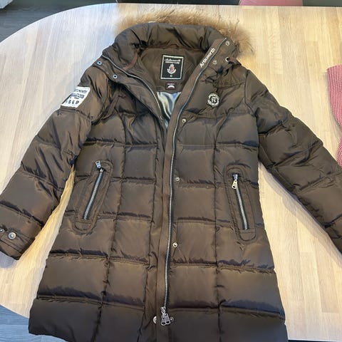 Olivengrønn dunjakke for dame i størrelse S. Jakken har lengre passform, glidelås og trykknapper i front, samt sidelommer med glidelås. Hetten er kantet med lyse brun ektepels. Yttermaterialet fremstår som glatt og slitesterkt, og jakken er vattert for ekstra varme. Passer som ytterjakke i kaldere vær. Både vann og vindtett.