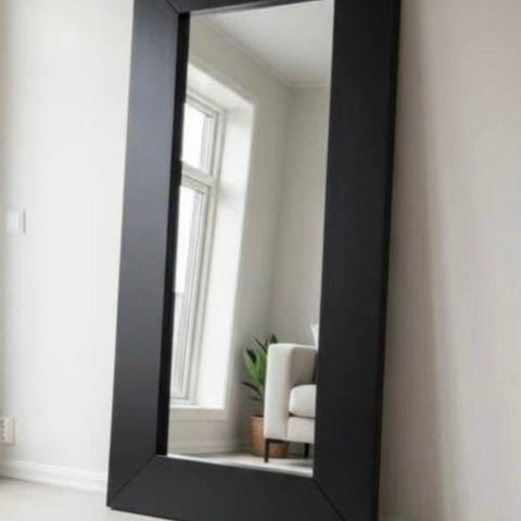 IKEA frittstående speil i helfigur med treramme. Speilet har integrert støtteben på baksiden som gjør at det kan plasseres frittstående på gulv.