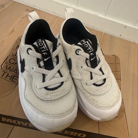 Nike Air Max barnesko i størrelse 23,5 unisex. Skoene er hvite med små svarte Nike-logoer. Overdelen er i tekstil med mesh-paneler for ventilasjon, kombinert med syntetiske detaljer for ekstra støtte. Modellen har elastiske lisser og stropp bak for enklere av- og påkledning. Yttersåle i gummi gir godt grep, og mellomsålen har Air Max-demping for komfort ved lek og hverdagsbruk.