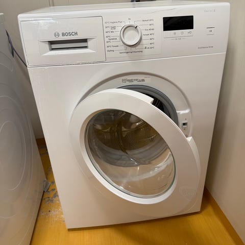 Bosch frontmatet vaskemaskin. Hvit modell med frontåpning og digitalt display. Maskinen har programvelger med flere standard vaskeprogrammer og tydelig betjeningspanel på toppen. Egnet for vanlig klesvask i husholdning, med luke i front for enkel inn- og utlasting av tøy.