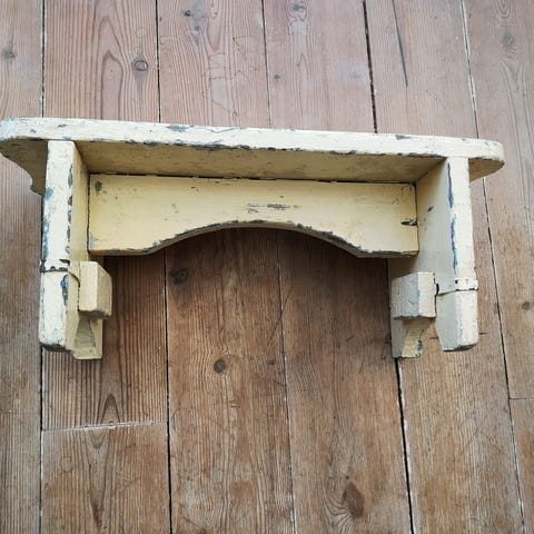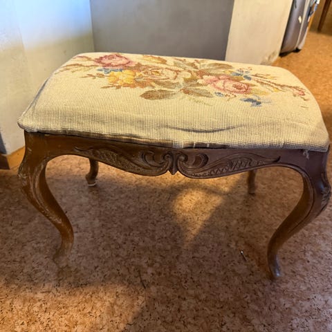 Krakk med rektangulært sete og utskårne treben. Setet er trukket i lyst tekstil med brodert blomstermønster i flere farger. Understell i tre med buede ben og dekorative utskjæringer.