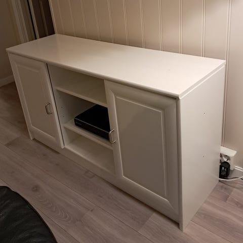 Tv- benk med hvite høyglans dører, grå på topp og sider. Ingen skader