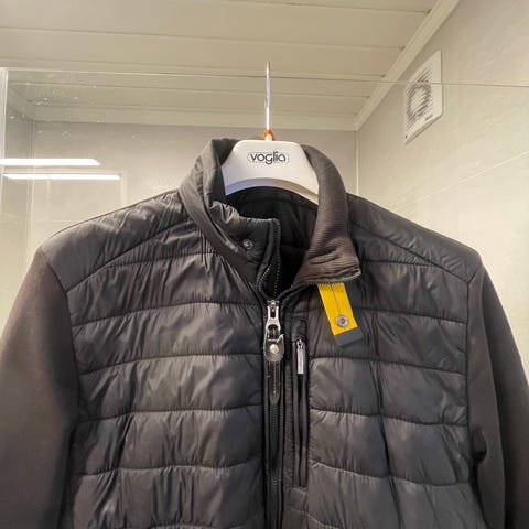 Jakken er svart og har vattert front og rygg kombinert med myke ermer i fleece-materiale. Den lukkes med glidelås i front og har glidelåslommer i sidene. Innvendig merking viser Parajumpers-logo og at plagget er i fleece.