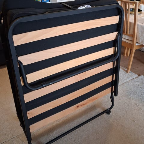 Jysk sammenleggbar gjesteseng med liggemål 80 x 190 cm. Sengen har metallramme med grå finish og lamellbunn i tre. Sengen kan foldes sammen for enkel oppbevaring og har hjul på rammen for lettere flytting. Egnet som ekstra seng eller gjesteseng i hjemmet eller på hytta. Kun brukt to ganger