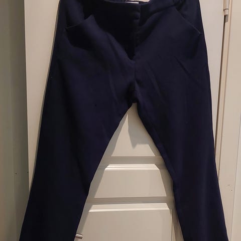 Blå kaffe bukse i størrelse M. Veldig behagelig på. 75% polyester og 25% viskose. Den har strikk i livet og smal benfasong. 2 gode lommer og dekorative lommer bak.