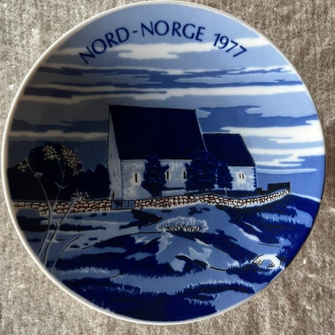 Buskerud Handikaplag Per og Kari veggtallerken Hol 1985 blå-hvit porselen