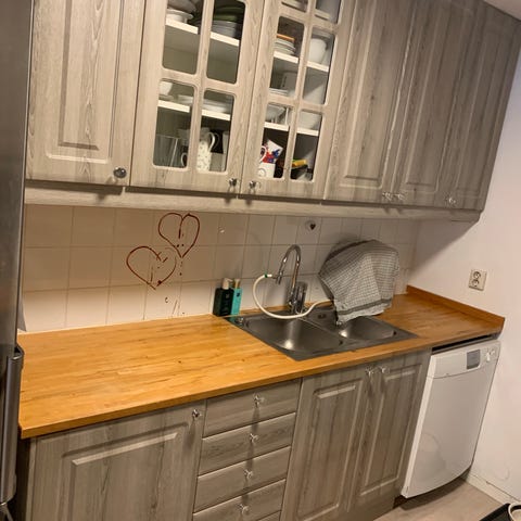 Selges billig! Må bort før helgen, da går det i bosset om ikke solgt til da. Hovedsakelig stammer, skuffer og fronter. Synlig brukt. Mangler en del småplukk. Selges uten hvitevarer og vask, men med benkeplate. Kjøpte det selv brukt på Finn for kr. 7000,- Ble demontert og tatt hjem, men vi valgte et annet kjøkken i stedet. Må vaskes ned da forrige eiere ikke hadde vasket det.
