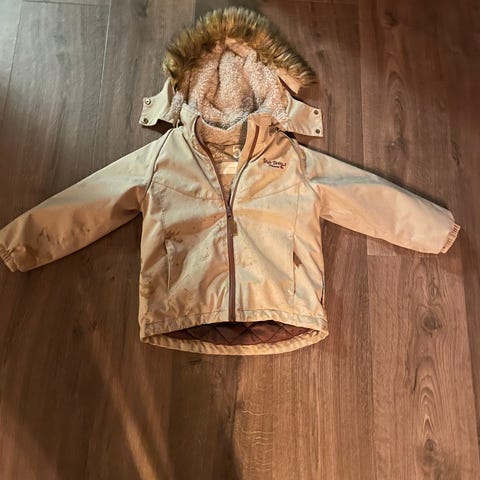 H&M vinterjakke for barn i størrelse 116. Jakken er brun og har ull i materialet. Den har hette med avtagbar fuskepelskant, glidelås og knappelukking foran, samt flere lommer. Passer til unisex bruk og er egnet som ytterjakke i den kaldere sesongen.