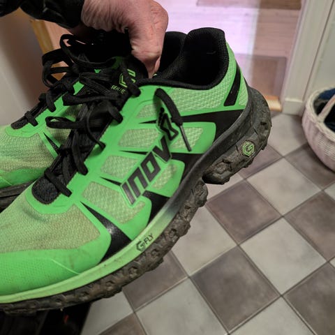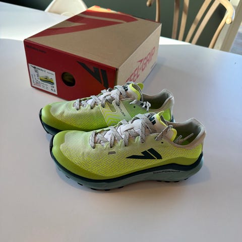 Skoen har overdel i tekstil/syntetisk materiale i svart med grønne detaljer og lisser. Yttersålen har grovt mønster for godt grep, og det står «Butyl Rubber» på esken, som viser til gummiblandingen i sålen. Passer til løping, for eksempel på sti eller variert underlag.
