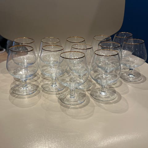 5 stk pene cognac glass i krystall. Hele og fine. Gullkant og inngraverte med blomstermotiv , mønster og gullkant,