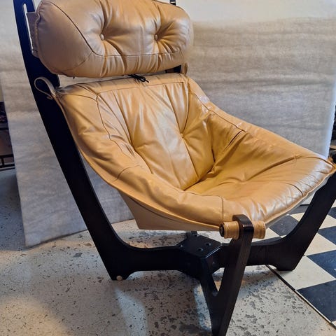 Dette er en retro stol med klassisk skandinavisk design med buet treverk med ei komfortabel skinnpute i fargen jordbrun. Odd Knutsen har laget denne flotte vintage stolen med navn Luna, og den kom i produksjon hos Hjellegjerde rundt 1973-74 en gang.