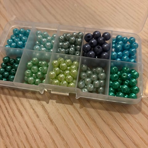 Perlesett med små perler i ulike blåtoner og hvitt til bruk for å lage smykker og armbånd. Inneholder både matte og transparente varianter. Egnet til enkel smykkelaging, dekorasjon og annen hobbybruk.