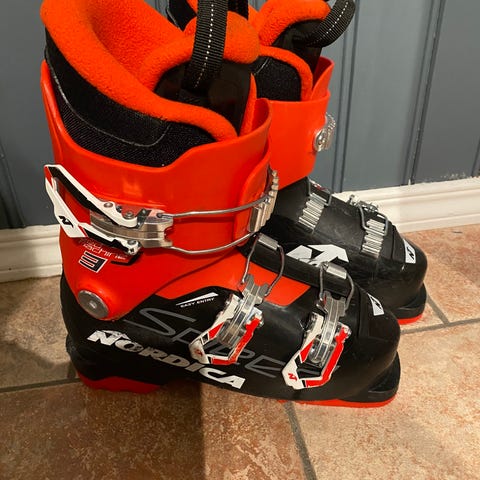 Salomon alpinstøvler i størrelse 23.5. Støvlene har fire spenner og powerstrap for justering og god tilpasning rundt fot og legg. Ytterskall i svart og oransje plast med polstret innerdel for komfort. Egnet til bruk i alpinbakke med vanlige alpinbindinger.