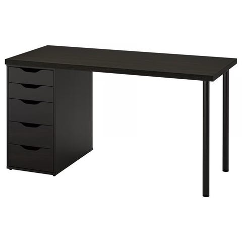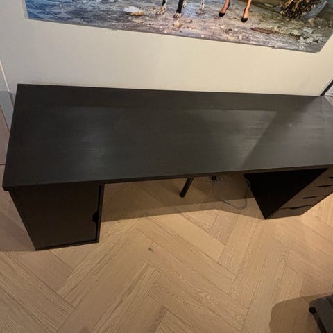 IKEA skrivebord med skuffeseksjon i hvit utførelse. Skrivebordet har en bordplate støttet av ben på den ene siden og en skuffeseksjon på den andre siden. Bordplaten ligger løst oppå. Er mulig å kjøpe til 2 ben og bruke skrivebord og skuffene hver for seg. Skuffeseksjonen består av fem skuffer med utsparinger som håndtak. Egnet som arbeidsbord eller studiebord i hjemmekontor, stue eller soverom. Overflaten er glatt og lett å tørke av.