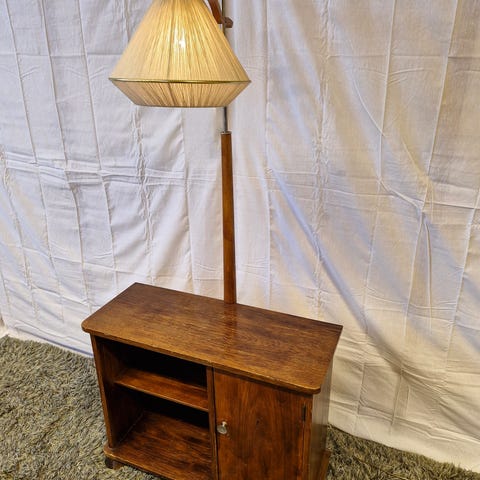 Dette er et vintage lampebord, en kombinasjon av en liten bordlampe og et lite bord, sannsynligvis fra midten av det 20. århundre. Trenger omsorg.