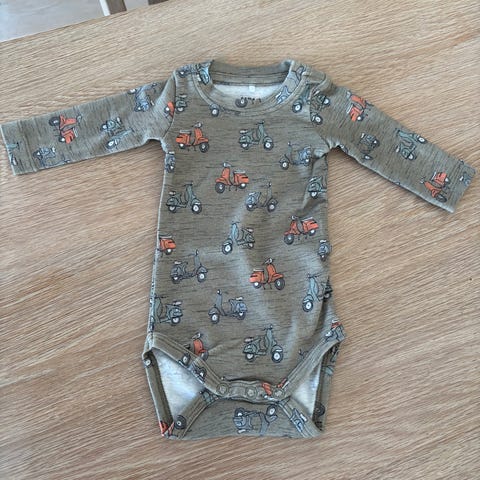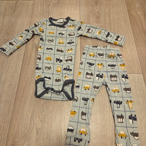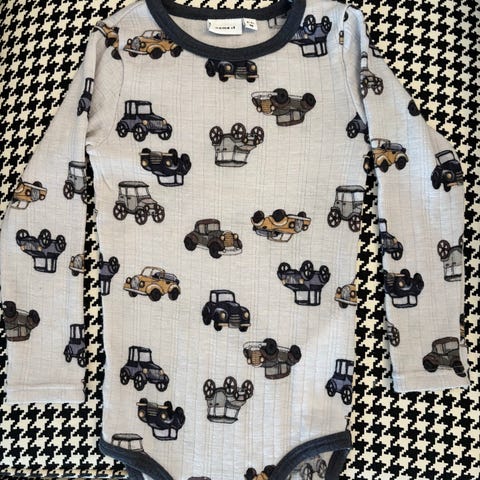 Name it body for gutt i størrelse 68. Langermet body i flerfarget mønster med biler, med kontrastkant rundt hals og benåpning. Passer til hverdagsbruk alene eller under andre plagg. Følger også med en Janus blå ullbukse :)