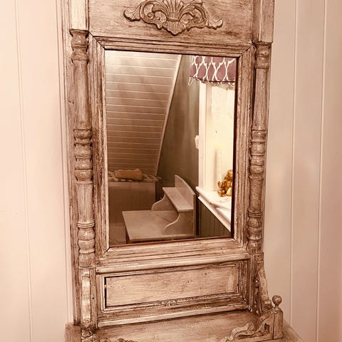 Rektangulært veggspeil med dekorativ treramme og utskårne detaljer.