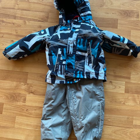 Kjempesøtt jakke i str 110 og 2 par bukse, str 104 og 110. Jakke ble brukt i 4 års alder med mindre bukse i str 104, og i 5 år alder med str 110. (Kun i helger, aldri i bhg). Jakken kan brukes 2 sesonger.