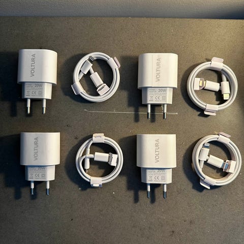To hurtigladere med tilhørende lightning ladekabler. Produktet inkluderer to veggladere og to ladekabler. Egnet for lading av kompatible Apple-enheter (iPhone 5-14).