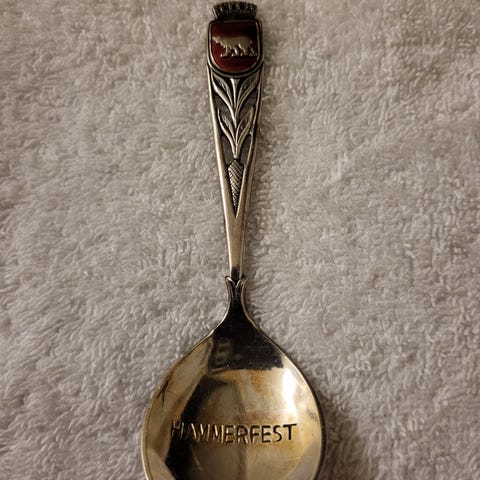 Merked med N 40, noe som betyr at den er laget i Norge. Trolig svært gammel. Tror den er sølvplett.