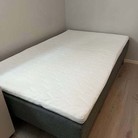 120cm seng med overmadrass. Passer som enkeltseng eller mindre dobbeltseng, avhengig av mål. Usikker på alder, men ingen skader.