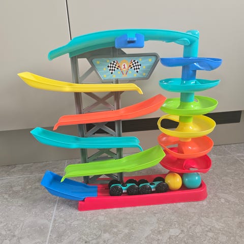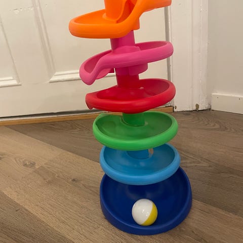 Fargerik kulebane for små barn. Ballene ruller fint hele veien ned, veldig engasjerende å se på.