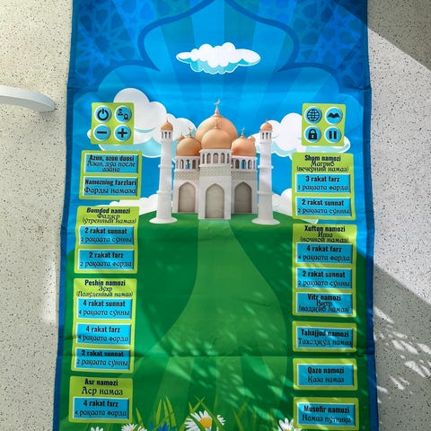 My Salah Mat Smart Interactive Prayer Mat bønneteppet for voksne og barn. Elektronisk bønneteppet med trykkfølsomme felter for hender og føtter, samt ikoner som viser ulike deler av bønnen. Matten har innebygde høyttalere og styreenhet øverst, og kan gi lydveiledning og instruksjoner. Fargegradient fra svart øverst til grønn nederst. Egnet for bruk innendørs som hjelpemiddel til å lære og gjennomføre bønn. Drives av elektronisk enhet som er festet til teppet.