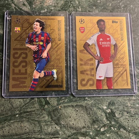 Panini FIFA 365 2024 fotballkort med motiv av Liverpool-spillere, Mohamed salah og Alexis Mac allister. Kortene er spesialkort med holografiske og fargerike design, inkludert Top Master-kort. Baksiden av kortene har spillkode og standard informasjon fra Panini. Egnet for samling og bytting av fotballkort i FIFA 365-serien.