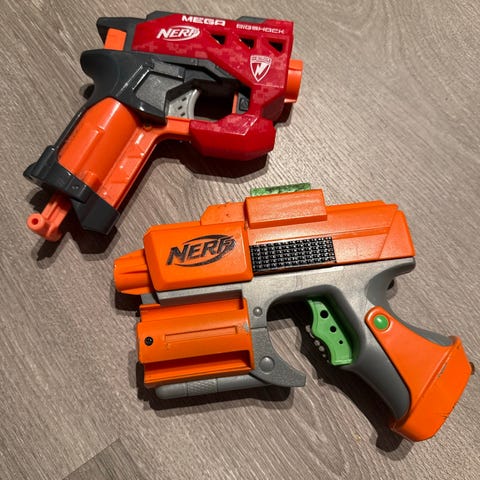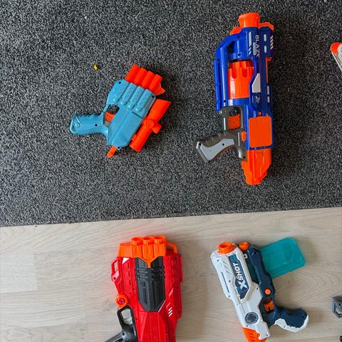 Nerf lekeblastere sett med flere ulike blastere og magasiner. Bildene viser blant annet to oransje/gule blastere, én blå/oransje blaster, én hvit/grå/oransje blaster og to mindre blastere i oransje/grå og blå/oransje. I tillegg følger det med flere oransje magasiner. Passer til lek med Nerf-skumprosjektiler (piler/darts, ikke inkludert på bildene)
