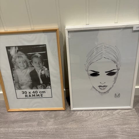 Bilderammer i tre i ulike størrelser, i brun og svart finish. Rammene har klassisk profilert kant og er rektangulære, noen med fasetthjørner. Passer til innramming av bilder, foto eller kunst. Leveres uten glass og bakplate etter bildene som vises. Opphengstråd i messing kan flyttes og bxh byttes om. Selges gjerne samlet for kr 1.000,- Prissetting pr bilde.
