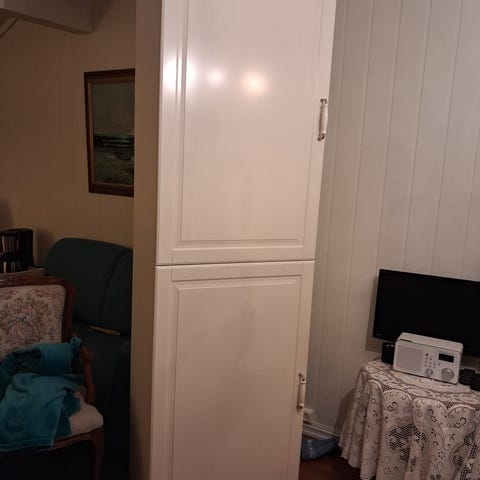 Høyskap fra IKEA gis bort. Skapet er pent brukt, og har profilerte dører i lys cremefarge.