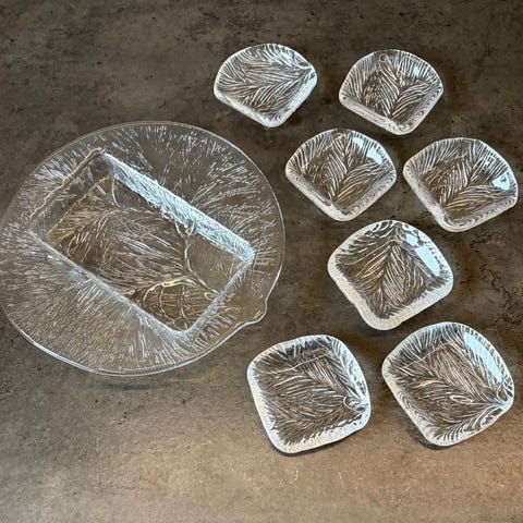Selger et vintage fat/kakefat fra Hadeland Glassverk, modell Furu. Norsk design av Severin Brørby og opprinnelig produsert fra 1970-tallet. Fatet er 32 cm i diameter. Veldig bra stand. Knapt spor av bruk. Ingen skader. 150 kr. Kan hentes (Grünerløkka eller Sentrum) eller sendes.