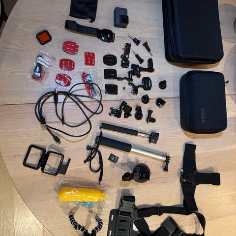 Et tilbehørssett for actionkameraer som inneholder mange praktiske fester, for eksempel et brystbånd og pannebånd, et sykkelfeste, et flytende håndtak