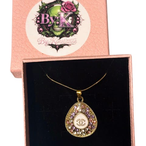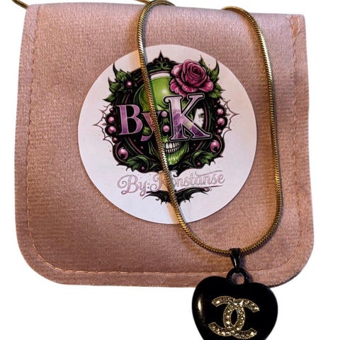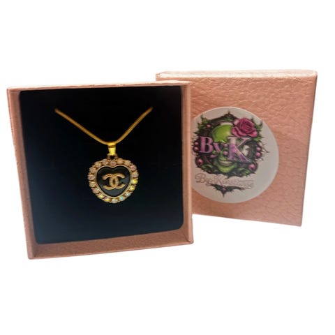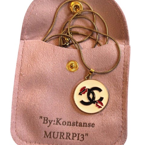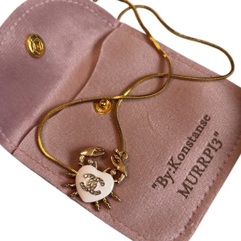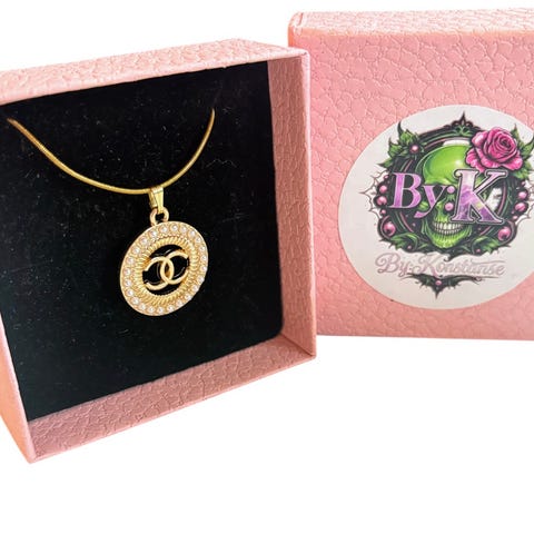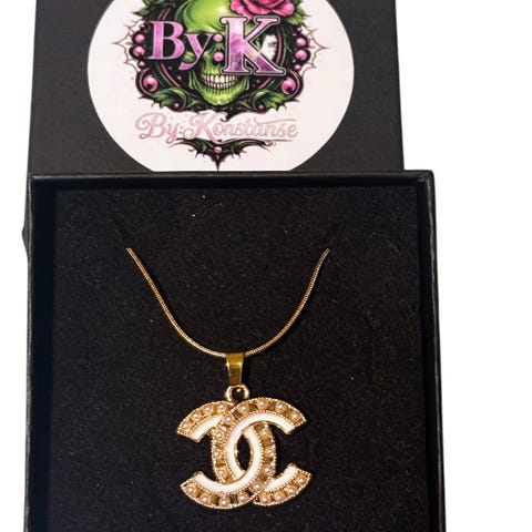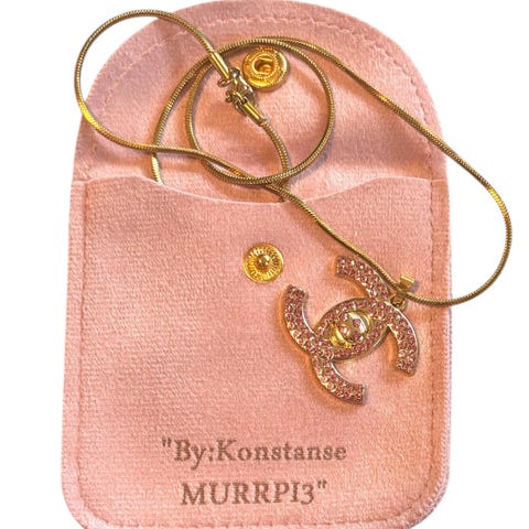 Nydelig gulltonet Chanel halskjede, CC logo hvor den ene C'en er Gullfarget og den andre er pyntet med klare glitrende krystaller. Smykket er re-designet fra et vintage Chanel anheng, og er nå er komplett smykke! Henger på et gullbelagt snake halskjede, i rustfritt stål, 45cm i lengde +5cm ekstra regulerende lengde lenke.