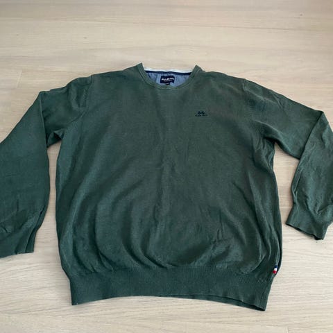100 % bomullsgenser med morsomt mønster foran og bak. Grønn og svart. Har vært brukt, men i god stand. Ingen hull eller merker. Størrelse XS til S. Skulder til bunn 60 cm. Bredde 40 cm. Skulderfeste til håndledd 59 cm. Armhule til håndledd 48 cm.