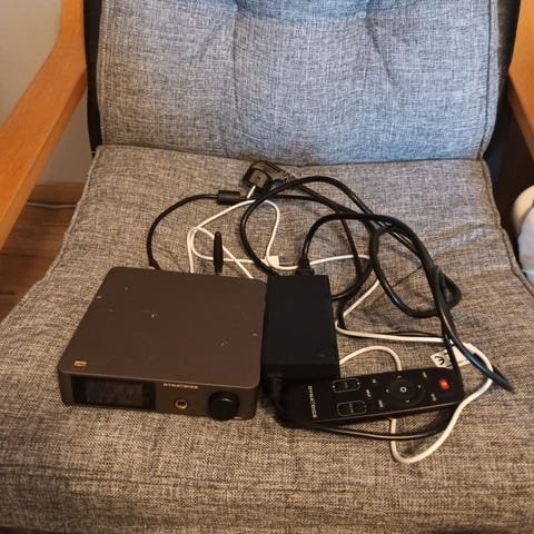 Dynaudio Connect trådløs lydsender. Enheten fungerer som et grensesnitt mellom lydkilder og kompatible Dynaudio-høyttalere. På baksiden finnes flere tilkoblingsmuligheter, blant annet analoge RCA-innganger, optisk digital inngang, koaksial digital inngang, USB-inngang og nettverksport. På bildene vises også medfølgende strømforsyning og diverse signalkabler. Produktet er egnet for tilkobling av ulike lydkilder som TV, PC, CD-spiller eller andre enheter til Dynaudio-høyttalere via trådløs overføring.