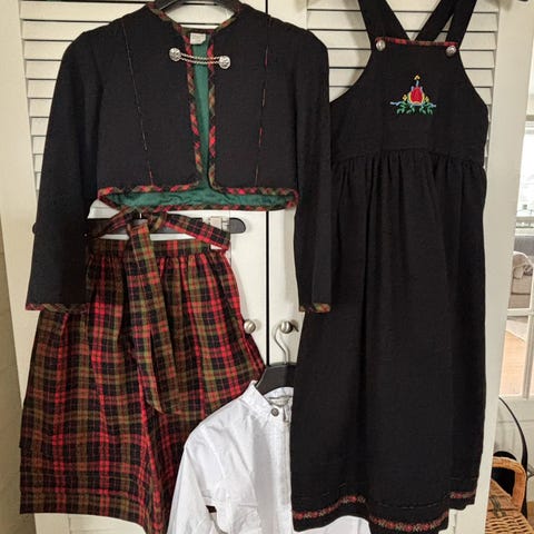 Festdrakt dame i størrelse XS. Skjørtet er svart og laget i bomull. Modellen har tradisjonell, lang fasong som passer til bruk sammen med bunadsliv, skjorte og tilbehør etter ønsket bunadstype. Den kommer med skjorte og søljer den er i rosa og ikke grønn som på bilde kunn brukt en gang på 17 mai i fjord i noen få timer og ikke brukt ellers den er god som ny