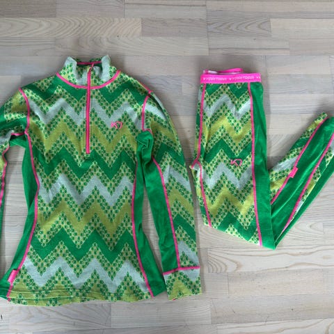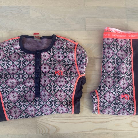 Kari Traa ullundertøy, 100% merinoull. Ulltrøya er i str L og ullbuksa i str M. Det har vært et lite hull på armen på ulltrøya som er sydd.