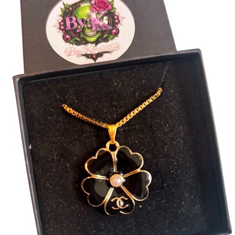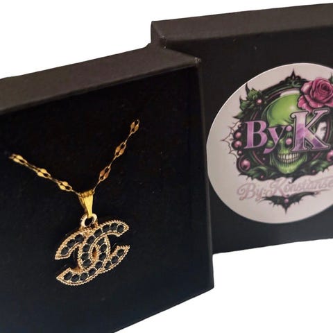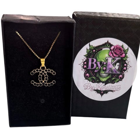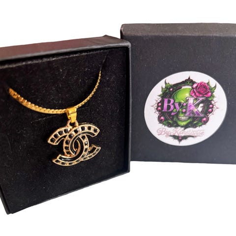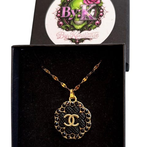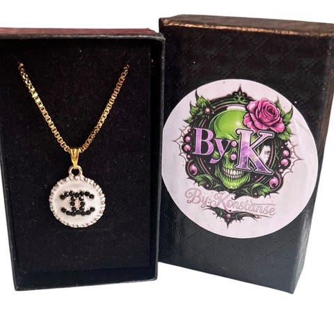 Vakkert Chanel halskjede, m/ hvit og gulltonet mønstret logo, re-design fra et vintage originalt luksus Chanel anheng. Henger på et Gullbelagt 50cm langt slange halskjede i rustfritt stål. Nydelig er det! Nå et komplett smykke!