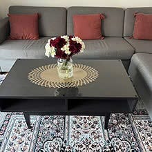 Stuebord fra Jysk. Solid har hatt kontrast plast på. Kan beskytter satt på på grunn av barn.