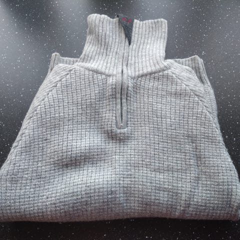 Ulvang høyhalset ullgenser i størrelse S (unisex). Genseren er grå med ribbestrikket struktur og høy hals med glidelås i en rød kontrastfarge. Laget i 100% ull, egnet som mellomlag eller ytterste lag ved lavere temperaturer. Passer til hverdagsbruk og friluftsaktiviteter der det er behov for varme og isolasjon.