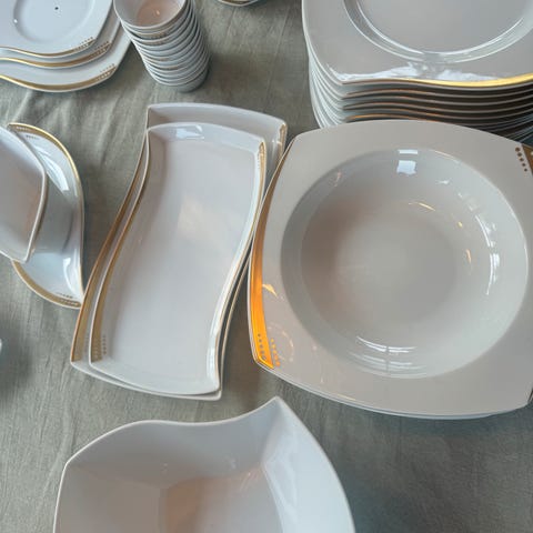 Servise i hvitt porselen med gullfarget dekor langs kantene. Serviset består av firkantede tallerkener med rund spiseflate i to størrelser, noen skåler og en vase(?). Designet har buede linjer og diskret mønster i gull langs kanten. Totalt 4 sett: