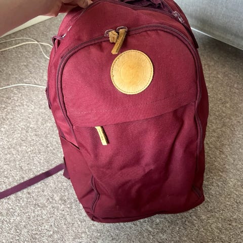 Fjällräven ryggsekk . Sekken har flere glidelåslommer og rom, inkludert hovedrom med innvendige lommer for organisering av mindre gjenstander. Ytterlommer på siden gir plass til for eksempel drikkeflaske eller annet utstyr. Justerbare skulderstropper gir tilpasning til bruker.