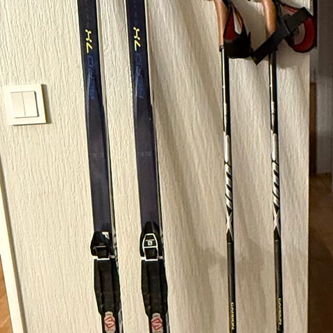Rossignol R-Skin Team langrennski med staver i svart og blå farge. Skiene har integrert fell (R-Skin) i festesonen og er utstyrt med Rottefella-bindingssystem. Passer til klassisk langrenn. Medfølgende staver er i matchende svart/blå design